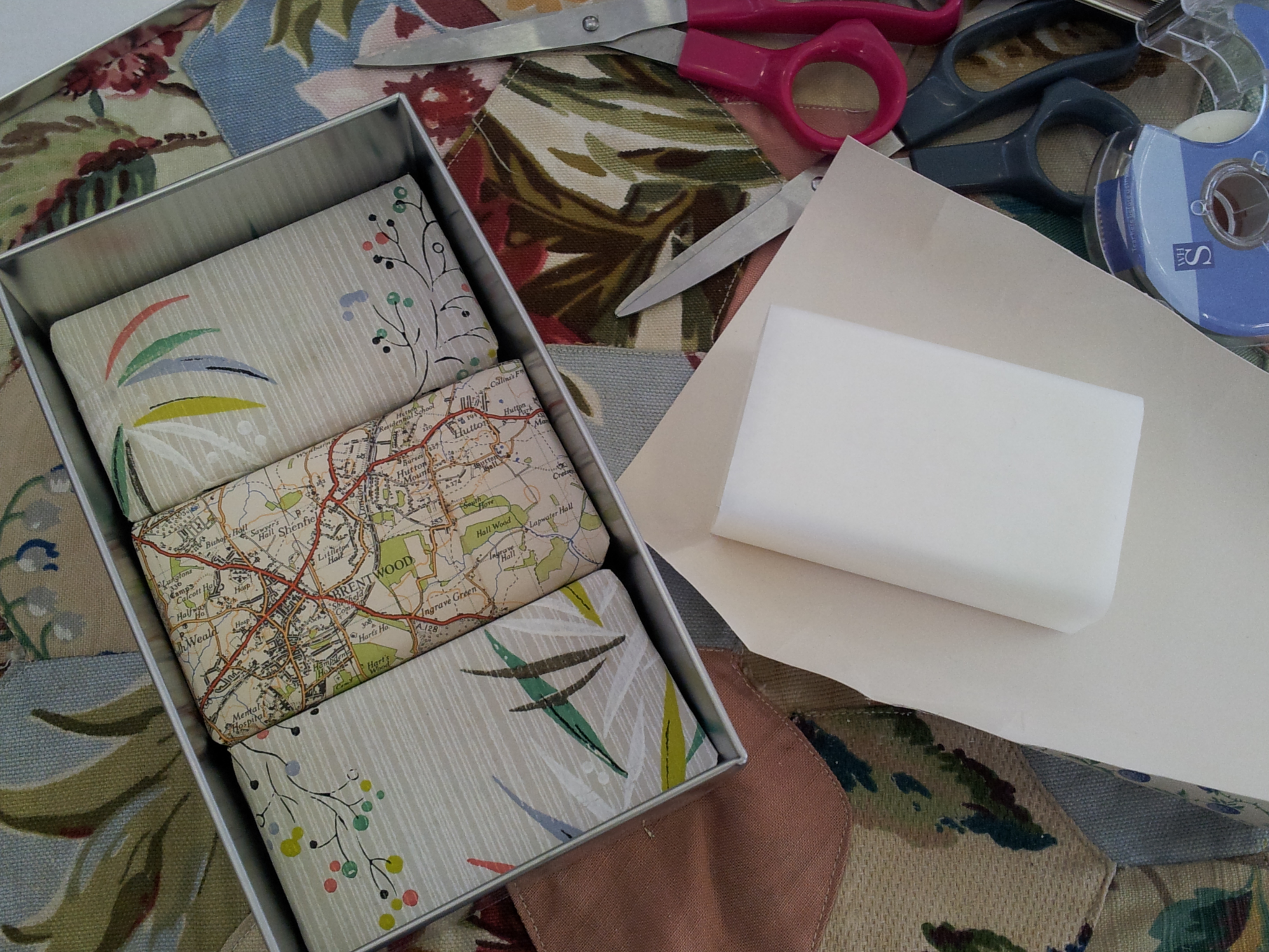 This is what I made when I met up with vintage crafter extraordinaire Sarah Moore (sarahmoorevintage.com). Use pretty remnants of wallpaper or gift wrap to package fragrant bars of soap then store in drawers to keep clothes fresh, or display in tins and boxes to give as gifts.