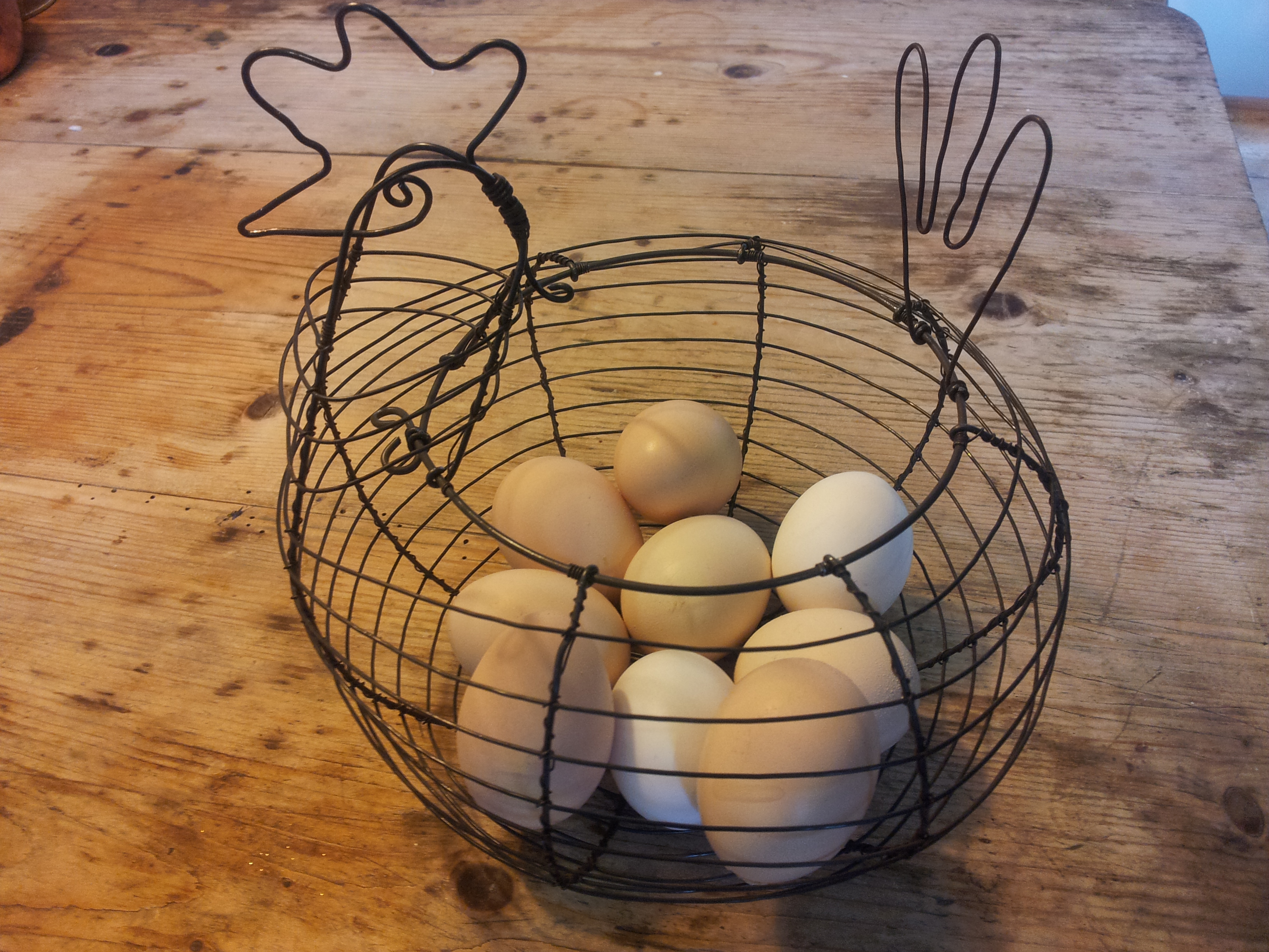 Freshly lain eggs in a wonderful chicken-shaped basket, handmade by the talented Dave of Love Wire. A lovely start to my Easter Sunday.